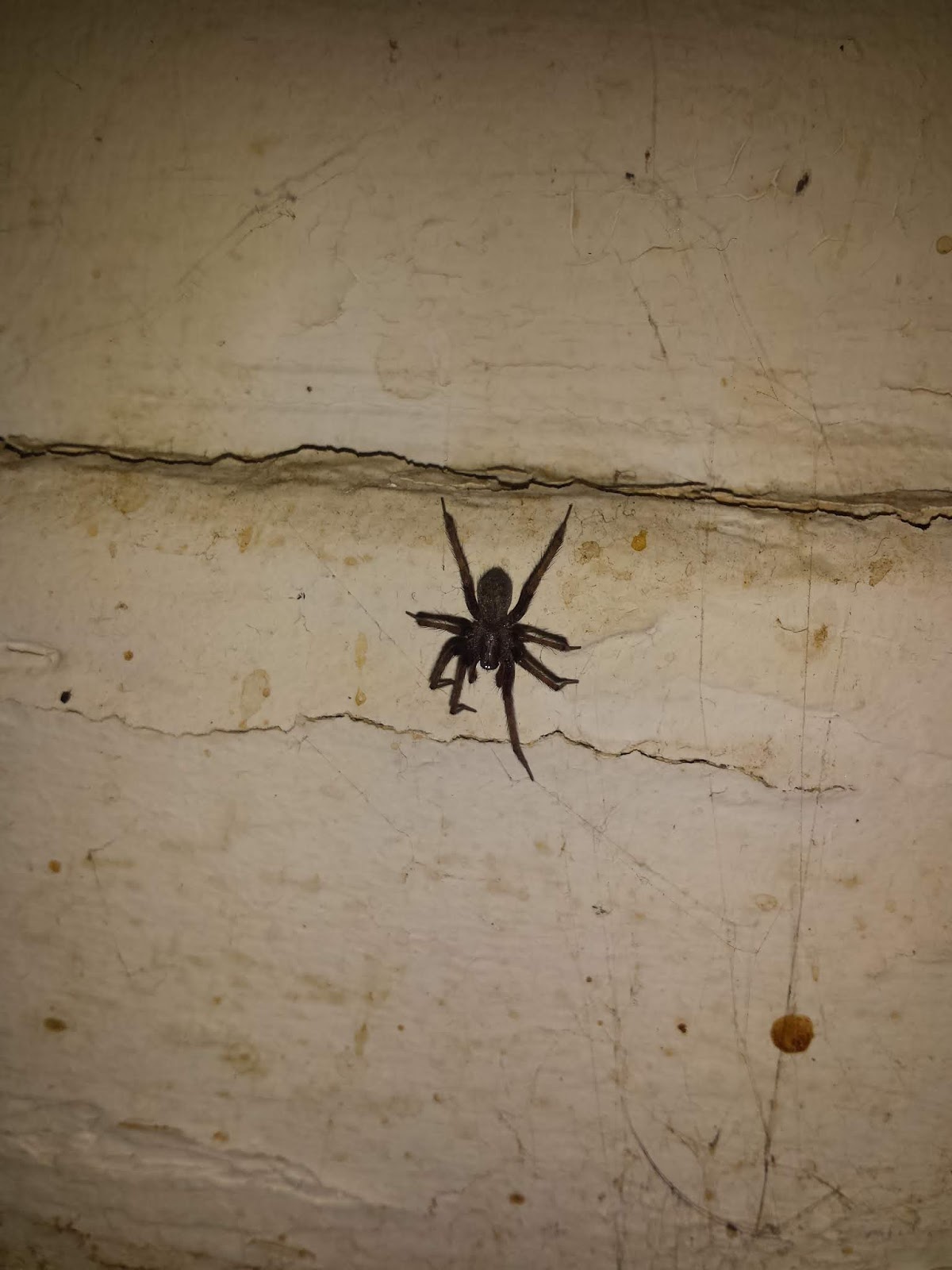 C'est vers les une heure du matin que j'ai rencontrer cette araignée noire et velue. Elle est de bon format et fait environ 1pouce de long entre les pates avant et arriere peut-être le même diamètre qu'un 10 cents. elle me semble être asser vigoureuse. Son corps poilu m'inspire peu confiance et j'ai préférer ne pas la poursuivre dans son racoin.
